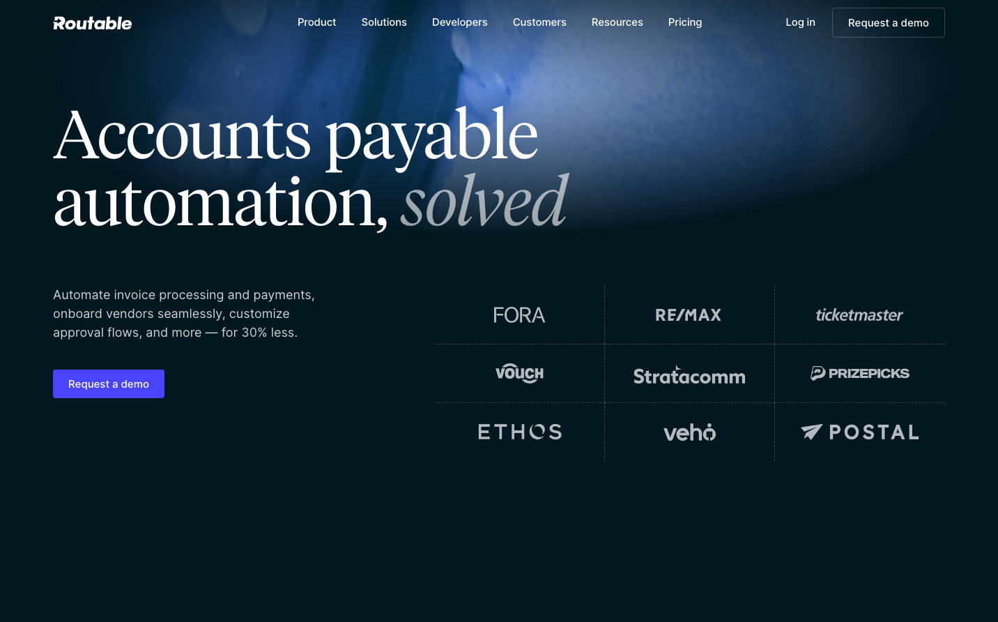 Routable presents a sophisticated nocturnal aesthetic with dramatic dark gradients that evoke premium enterprise software. The typography pairing of TiemposHeadline serif for display and Inter for UI creates an unexpected elegance that positions automation as craft rather than commodity.