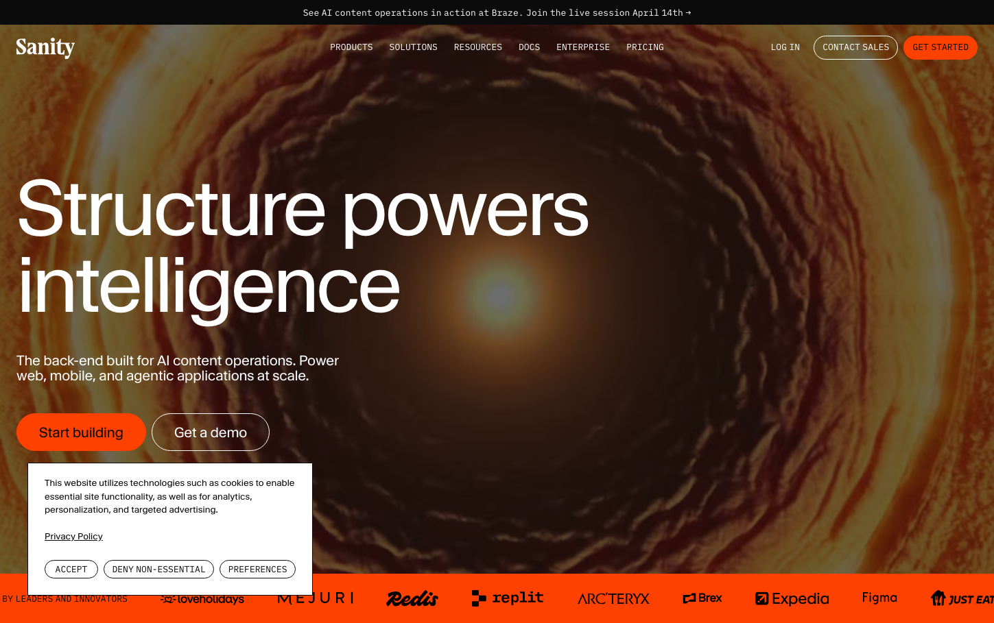 Sanity's brand radiates cosmic intelligence through a warm orange-to-burgundy gradient that suggests both sunset and neural networks. The massive 112px heading creates gravitational pull while the proprietary 'waldenburgNormal' typeface feels deliberately crafted yet approachable, communicating structured creativity.
