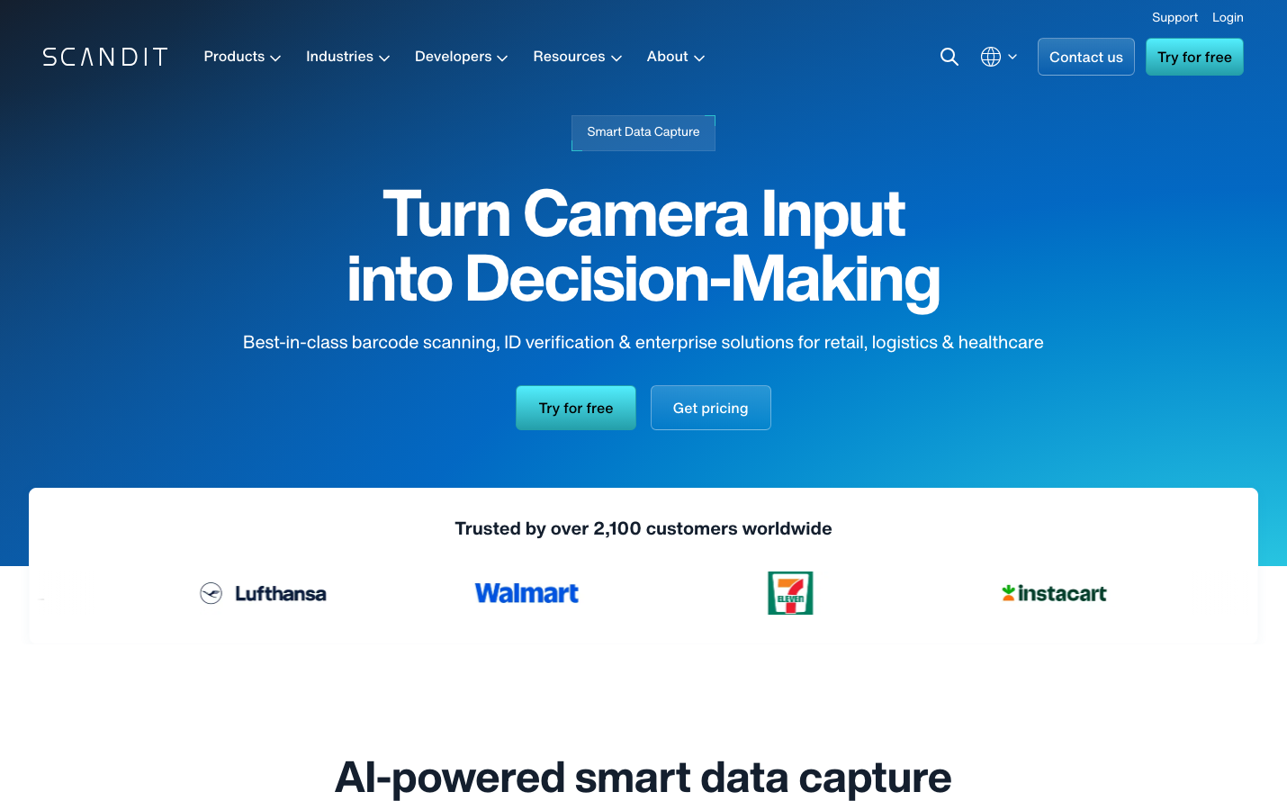 Scandit embodies enterprise confidence through a deep ocean-blue gradient that commands trust and authority. The typography feels deliberate and corporate-precise, with bold headlines that communicate reliability without flash.