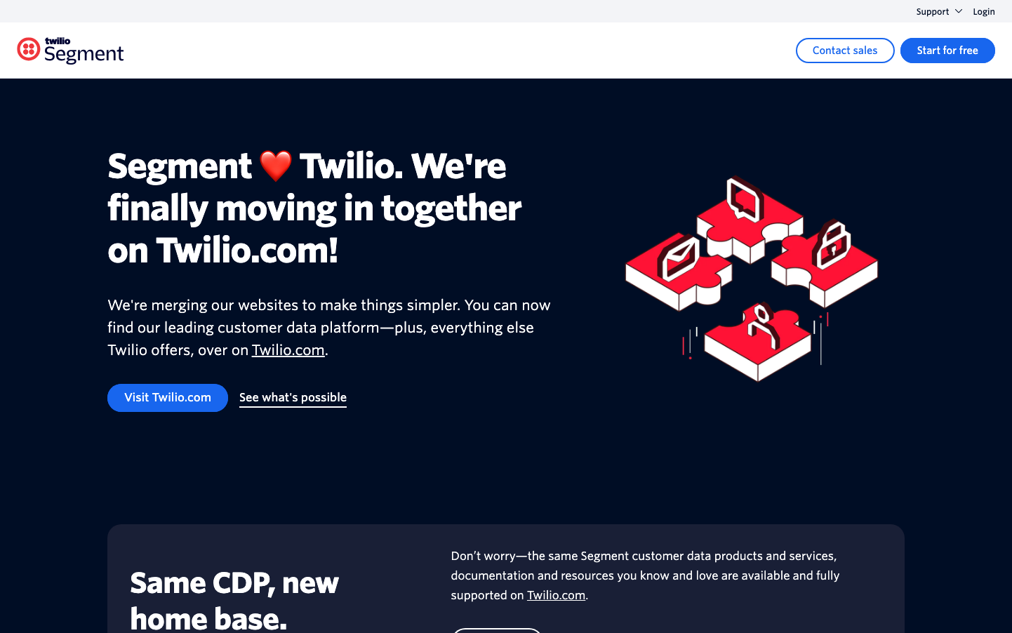 Segment's brand radiates corporate intimacy through its dramatic midnight navy backdrop paired with vibrant red accent elements and Whitney SSm typography that feels both authoritative and approachable. The design tells a story of enterprise-grade reliability wrapped in human warmth, where technical sophistication meets emotional connection through the prominent heart symbol and conversational messaging.