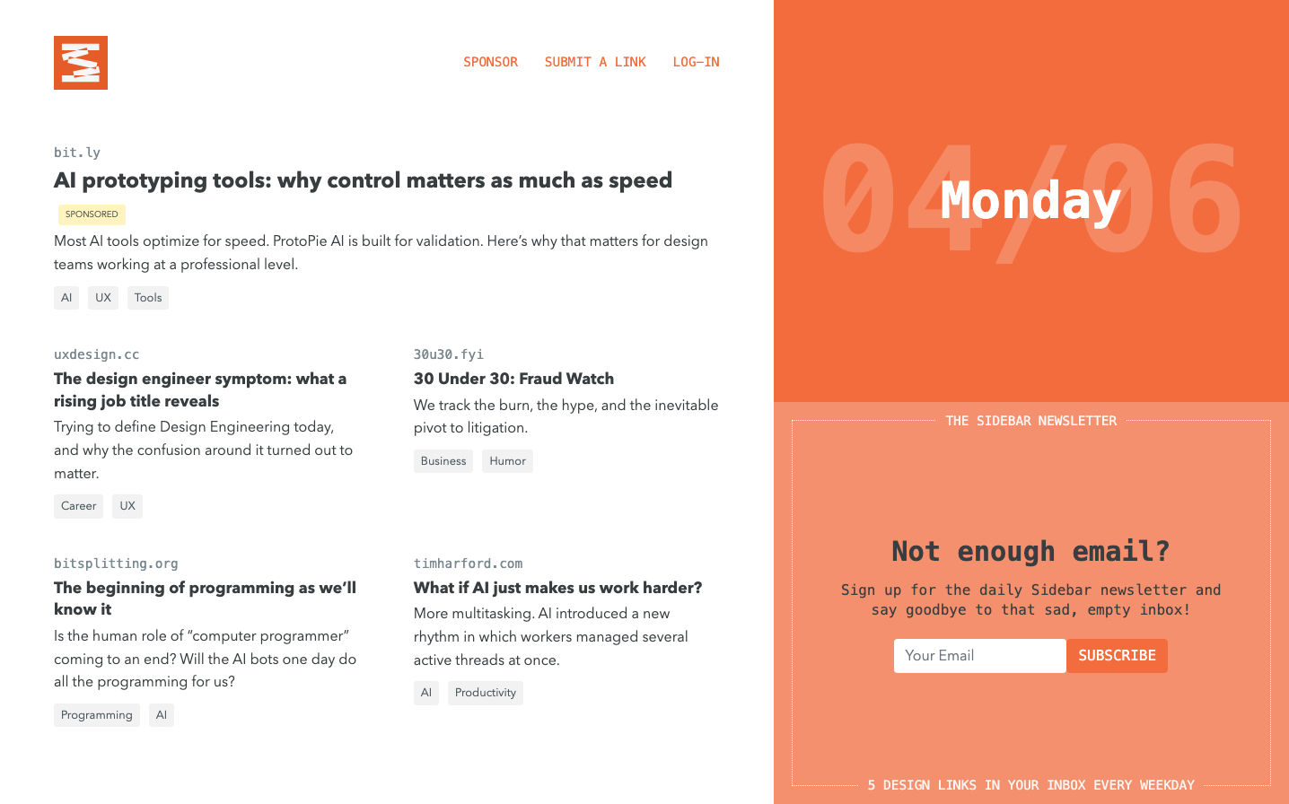 Sidebar combines editorial sophistication with developer precision through a distinctive dual-typography system—IBM Plex Mono headlines create technical authority while Avenir Next body text ensures readability. The dominant coral-orange palette creates an unexpectedly warm, energetic atmosphere that breaks from typical tech industry blues and grays.