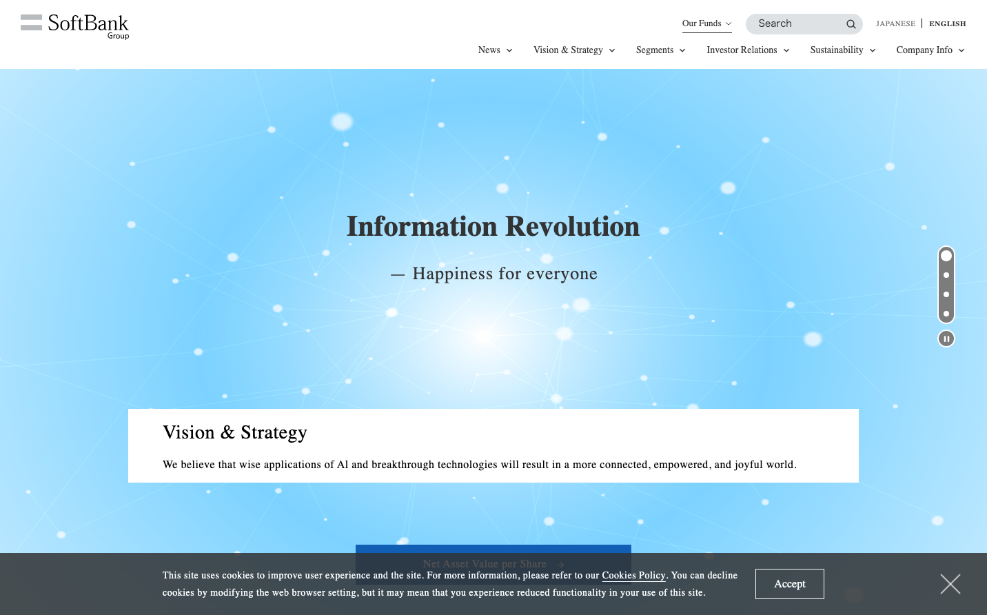 SoftBank creates a visionary tech aesthetic through ethereal sky-blue gradients with floating bokeh particles that suggest infinite digital possibilities. The bold serif headlines in deep brown contrast dramatically against the dreamy atmosphere, creating an emotional tension between grounded corporate authority and limitless technological aspiration.