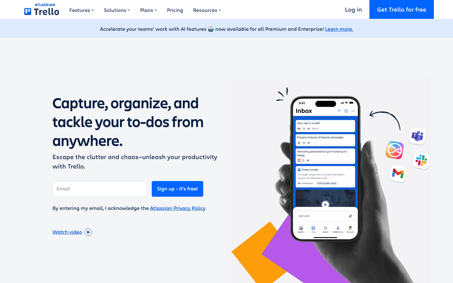 Trello's brand radiates accessible productivity with a vibrant blue that feels both trustworthy and energetic. The Charlie typeface family creates a friendly yet professional tone, while the clean layout emphasizes clarity over complexity, making task management feel approachable rather than overwhelming.