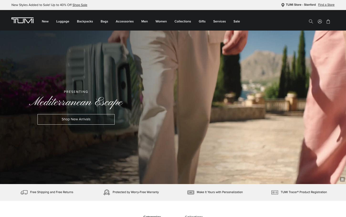 Tumi's brand identity embodies sophisticated luxury travel through cinematic storytelling and experiential design. The warm, Mediterranean-inspired palette evokes wanderlust and premium lifestyle aspirations, while the elegant script typography creates an intimate, personalized connection with discerning travelers.