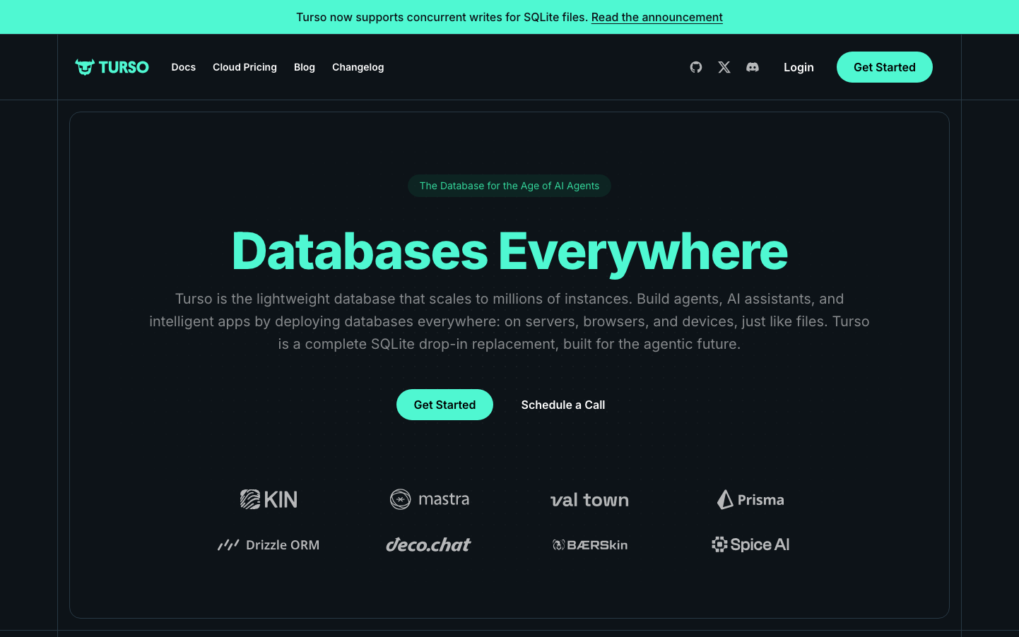 Turso's brand embodies a nocturnal tech aesthetic with electric mint green (#4FFFDB) cutting through deep charcoal backgrounds, creating an atmosphere of premium developer tooling. The heavy Inter typography (800 weight headers) communicates industrial strength while the vibrant accent color suggests innovation and AI-forward thinking.