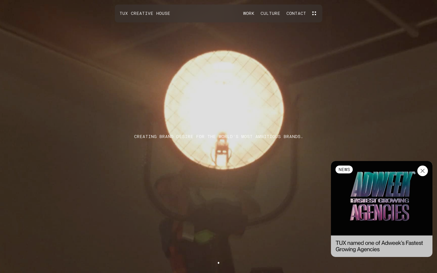 TUX Creative embodies a cinematic, nocturnal aesthetic with dramatic lighting effects and atmospheric depth. The warm golden glow against deep browns creates an otherworldly, almost mystical mood that speaks to brands seeking transcendent creative vision rather than conventional design solutions.