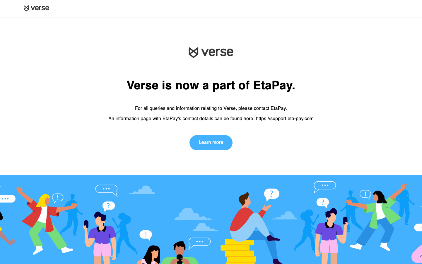 Verse embodies a transitional brand aesthetic - clean, corporate minimalism softened by playful illustration. The stark white acquisition notice contrasts beautifully with the vibrant blue community illustration below, creating a duality between business formality and human connection.