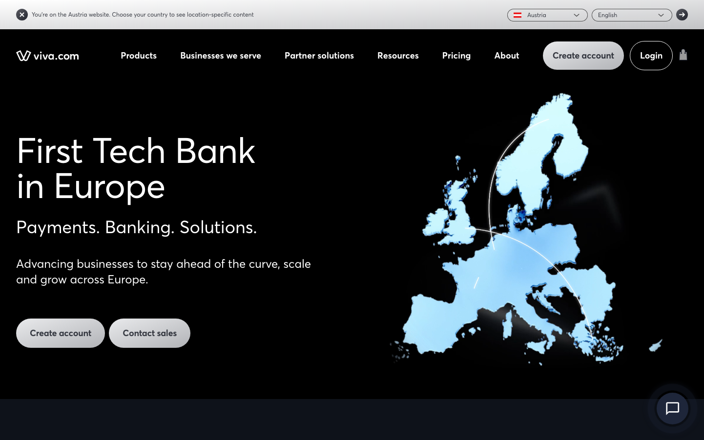Viva Wallet embodies fintech minimalism with stark black backdrops that command authority and subtle cyan accents that suggest digital precision. The AvertaPE typography creates approachable professionalism while the dramatic contrast between darkness and illuminated Europe map evokes technological sophistication conquering traditional banking.