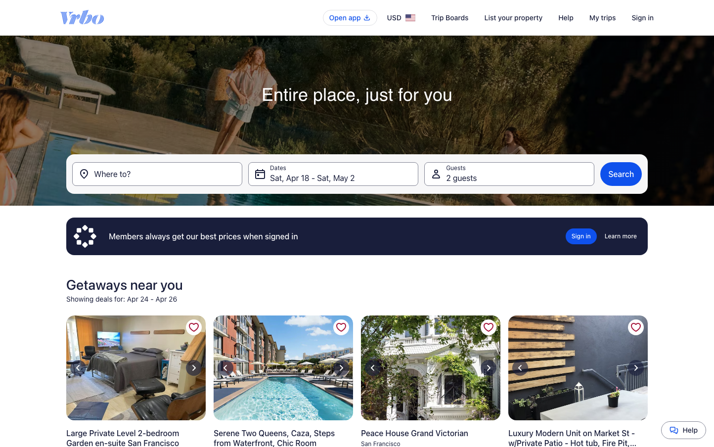 Vrbo embodies vacation luxury through warm, aspirational imagery paired with a calming blue-dominated interface that suggests trust and wanderlust. The dual typography system—flowing Albra Sans for headlines and structured Centra No2 for functionality—creates a perfect balance between emotional appeal and practical booking tools.