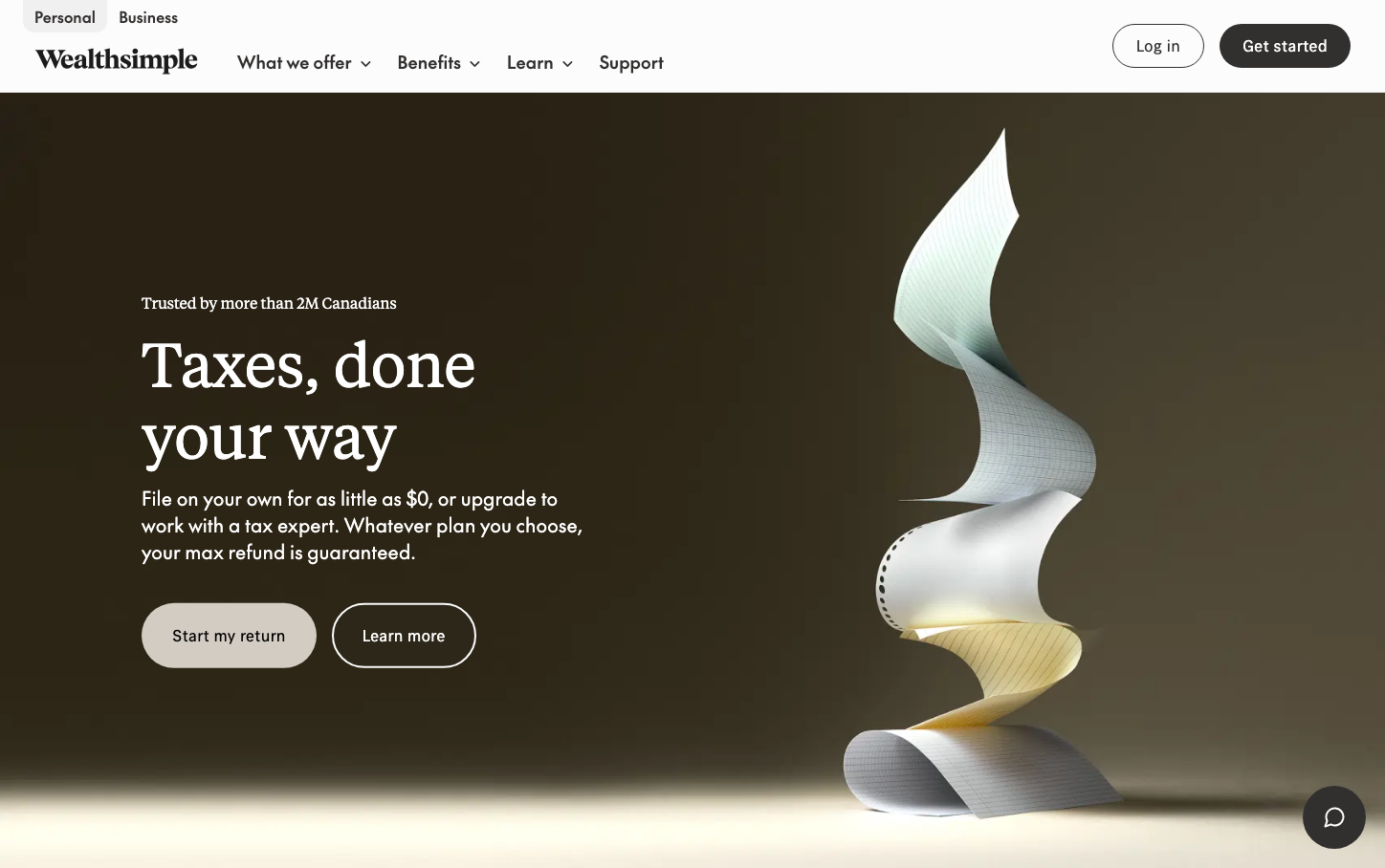 Wealthsimple embodies sophisticated minimalism through warm earth tones and elegant typography contrasts. The rich chocolate background paired with flowing sculptural elements creates an atmosphere of premium financial craftsmanship, while the serif-sans font pairing suggests both heritage trust and modern innovation.