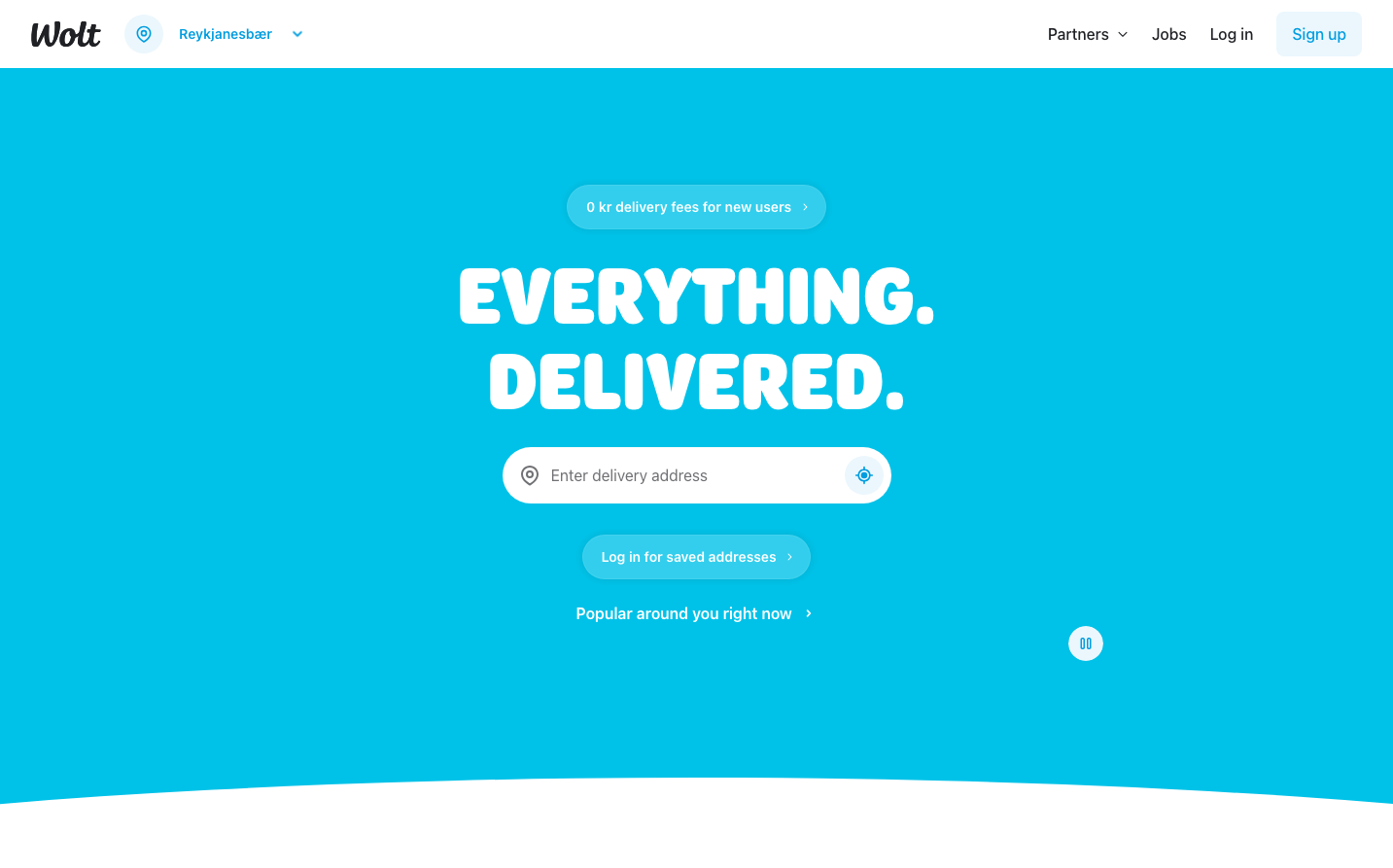 Wolt creates a vibrant, optimistic delivery experience through explosive electric blue backdrops and ultra-bold condensed typography that screams immediacy and convenience. The massive white typography against cyan creates an almost retinal energy that promises instant gratification.
