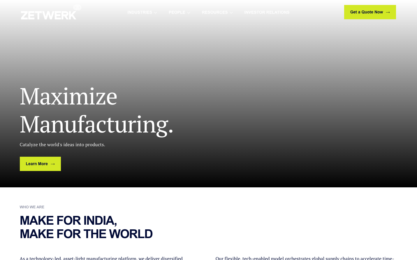 Zetwerk commands attention with a dramatic dark-to-light gradient backdrop that transitions from near-black to pristine white, creating an industrial sophistication that speaks to serious manufacturing ambitions. The electric lime-green accent color jolts against the monochromatic foundation, suggesting innovation disrupting traditional industry, while serif typography adds gravitas to bold manufacturing promises.