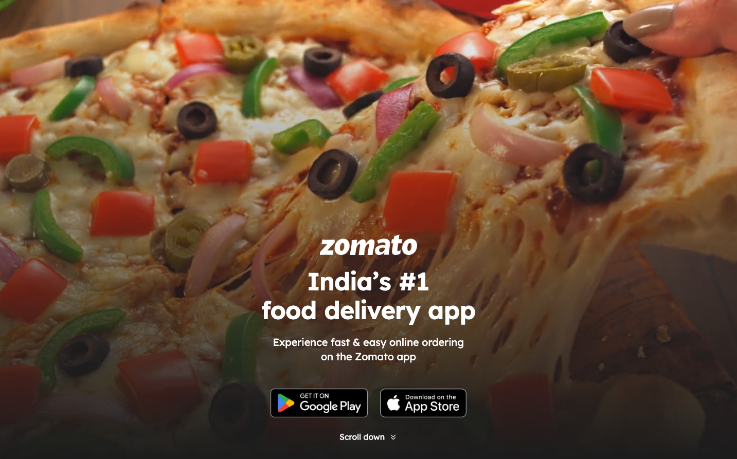 Zomato's brand aesthetic centers on food-forward imagery with crisp white typography overlaid on rich, appetizing photography. The design communicates hunger-inducing warmth through golden-orange food tones while maintaining digital accessibility through clean, rounded interface elements.