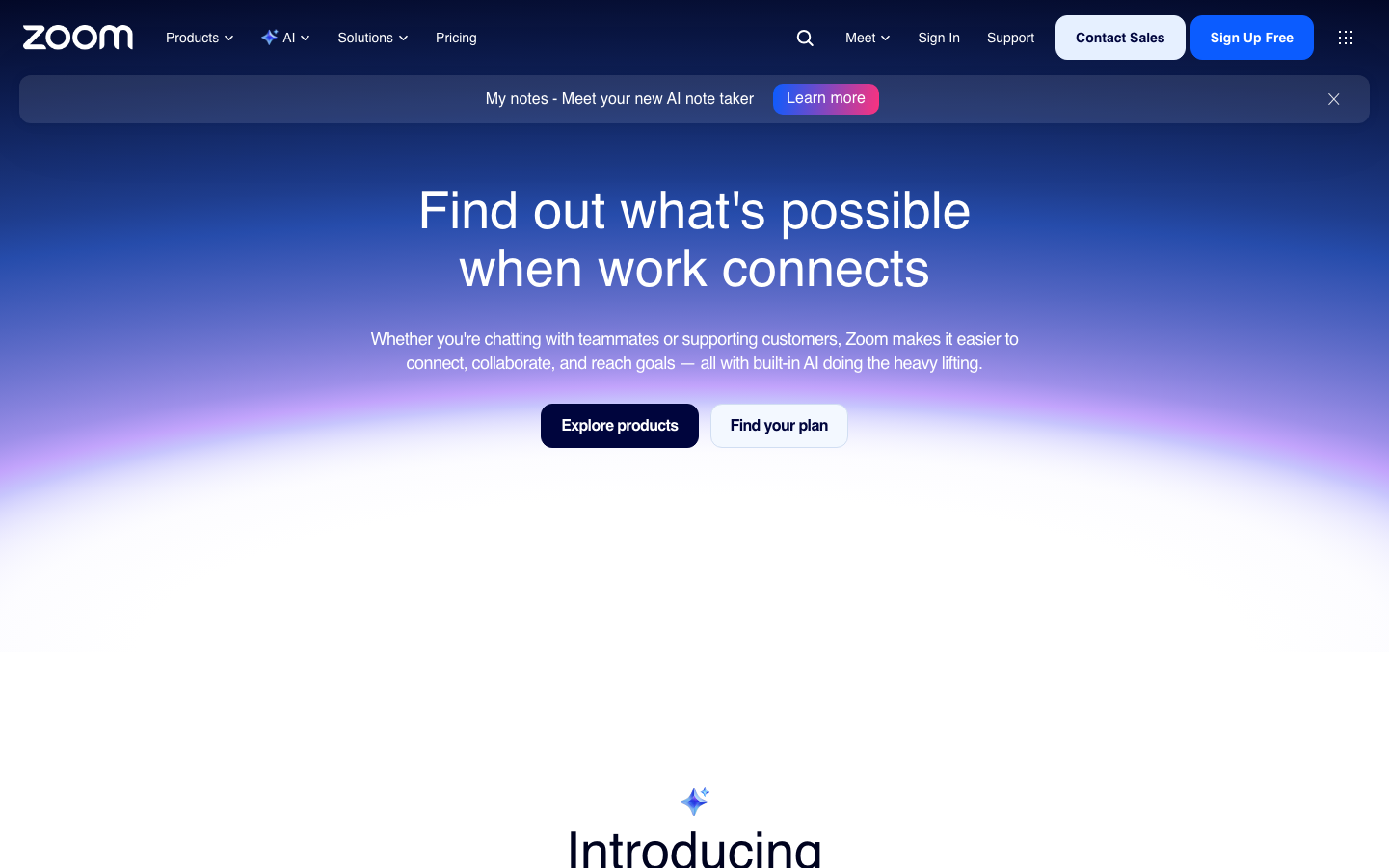 Zoom's brand embodies confident enterprise sophistication through its dramatic deep navy-to-purple gradient background that creates an immersive, almost cinematic atmosphere. The oversized 'Happy Face Semi Bold' headlines paired with clean Almaden Sans body text strike a balance between approachable personality and professional authority.