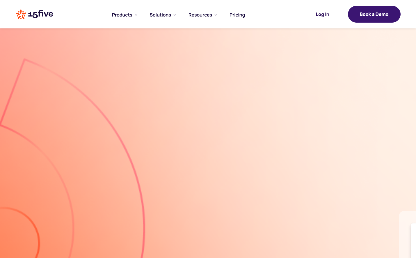 15Five creates a warm, approachable atmosphere through coral-to-peach gradient backgrounds paired with sophisticated serif headings and clean sans-serif body text. The design feels human-centered and optimistic, moving away from typical corporate coldness toward something more nurturing and growth-oriented.
