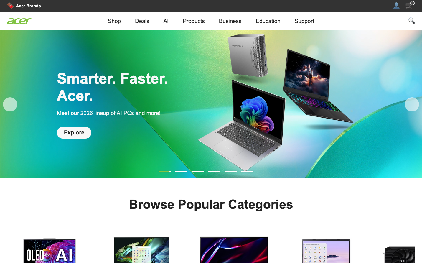 Acer's brand radiates tech-forward confidence through vibrant gradient backgrounds that flow from electric green to cyan blue, creating an immersive digital playground aesthetic. The bold 'Smarter. Faster. Acer.' typography commands attention while floating product imagery suggests innovation in motion, targeting users who crave cutting-edge performance.