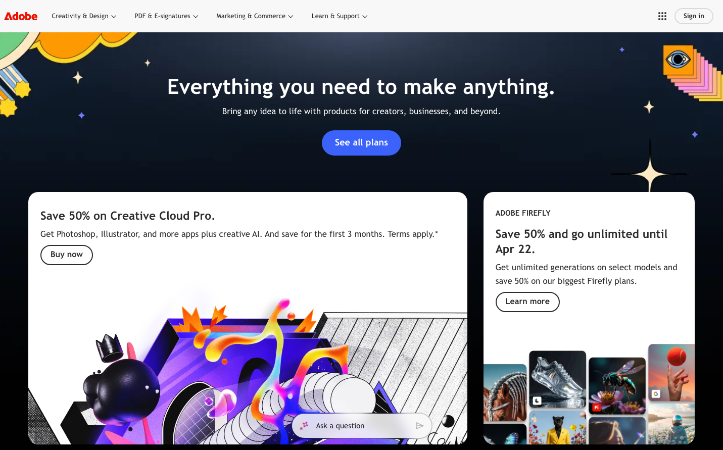 Adobe's brand radiates creative empowerment through dramatic dark navy backgrounds that make vibrant 3D elements and product imagery pop with cinematic intensity. The palette balances professional trust (deep blues) with creative energy (bright accent colors), while Adobe Clean typography delivers clear, authoritative messaging that speaks to both creators and enterprises.