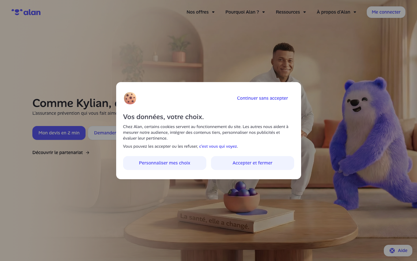 Alan creates a warm, approachable healthcare brand through vibrant purple gradients and friendly 3D character design. The custom AlanSans typeface with moderate weights (500) conveys trustworthy professionalism without clinical coldness, while the playful bear mascot humanizes digital health insurance.