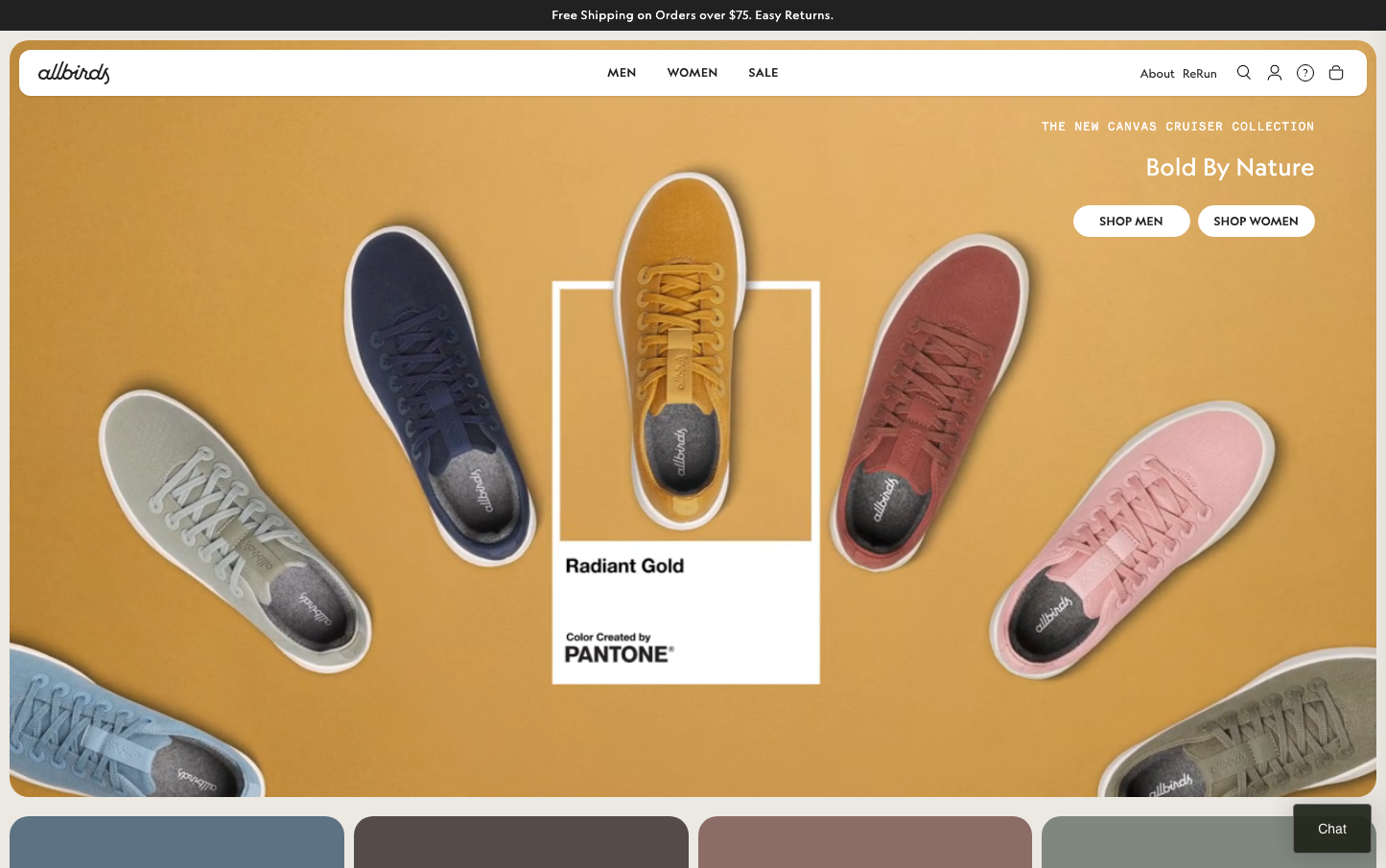 Allbirds embodies earth-conscious minimalism through warm, natural tones and the Geograph typeface that feels approachable yet refined. The radiant gold hero shoe against organic terracotta creates an uplifting, sustainable luxury aesthetic that whispers rather than shouts.