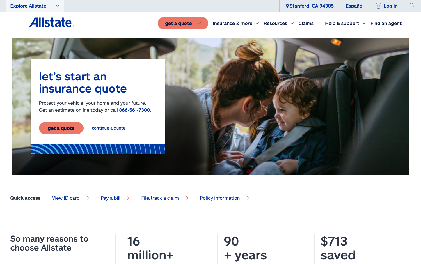 Allstate projects approachable protection through warm coral CTAs against a foundation of trustworthy navy blue, creating a family-friendly insurance brand that feels both reliable and inviting. The intimate car interior photo with mother and child establishes emotional connection while clean typography maintains professional credibility.