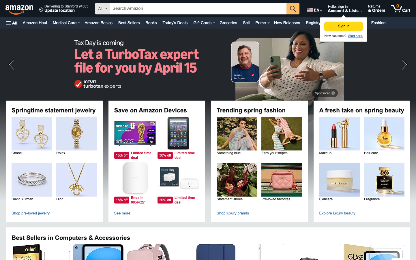 Amazon's design embodies marketplace maximalism - dense information architecture that prioritizes functional abundance over minimalist aesthetics. The warm orange accent against utilitarian grays creates a trustworthy yet energetic shopping atmosphere that feels both corporate and approachable.