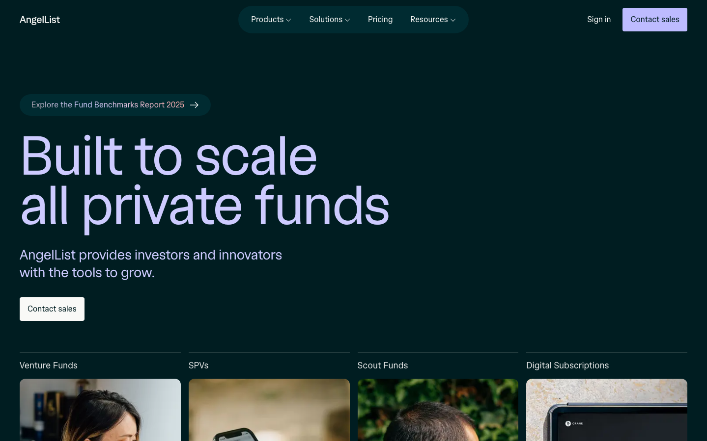 AngelList embodies sophisticated financial precision through a signature purple-to-blue gradient palette that suggests both innovation and institutional trust. The massive 112px display typography creates dramatic hierarchy while custom 'angellist' fonts establish proprietary authority, all set against a deep teal backdrop that feels both nocturnal and professional.
