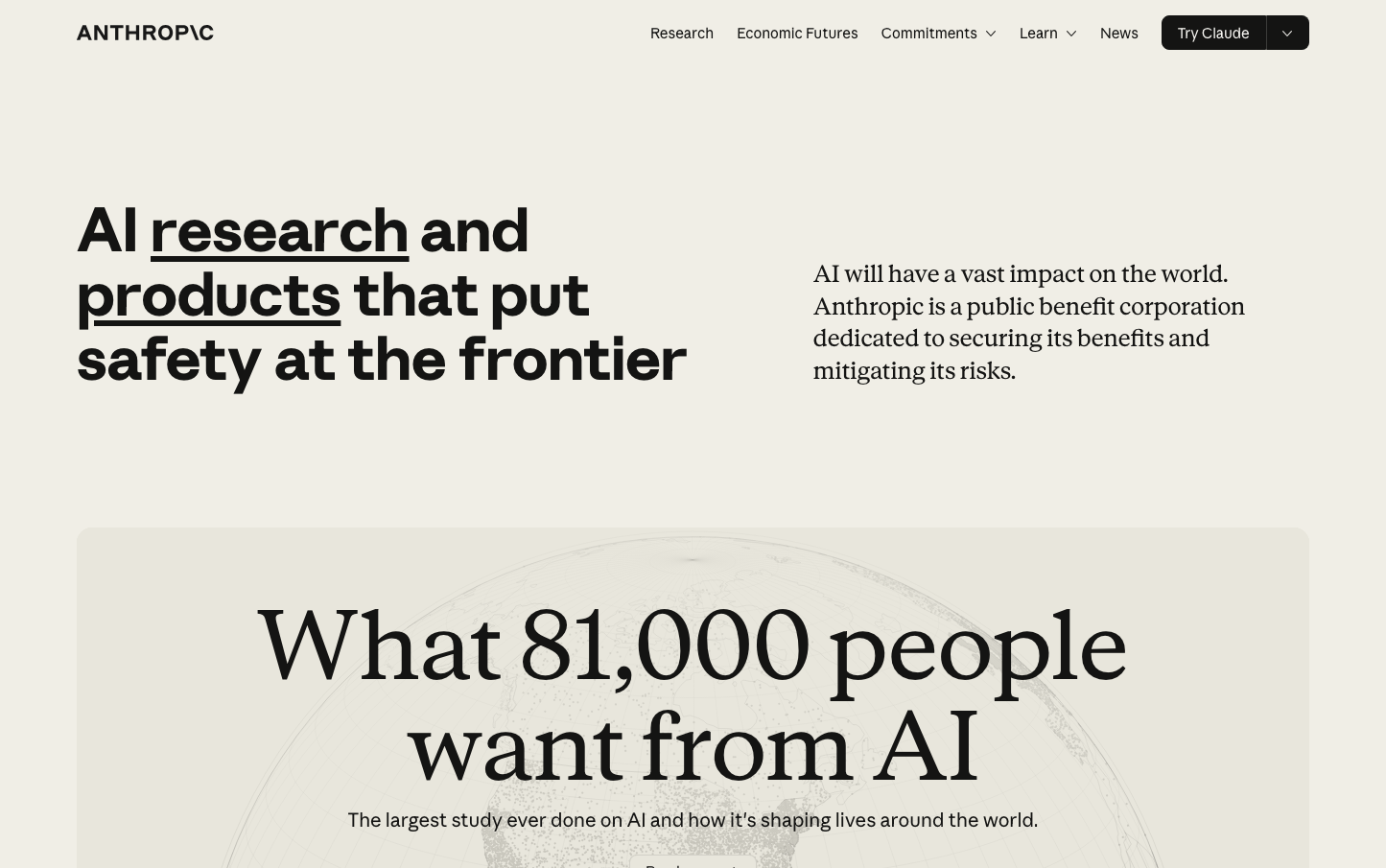 Anthropic's brand exudes scholarly gravitas through a sophisticated warm beige palette that feels like aged parchment, paired with a distinctive serif-sans typography duality that balances academic authority with modern accessibility. The design creates an atmosphere of intellectual trust and thoughtful deliberation around AI safety.