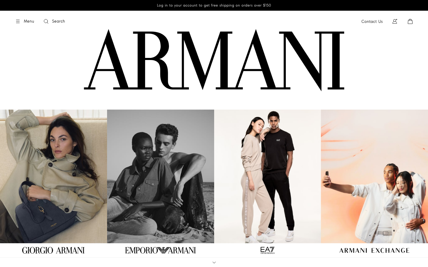 The massive, letterpress-style ARMANI wordmark dominates the viewport with museum-like reverence, creating instant recognition through typographic monumentality rather than decorative elements.