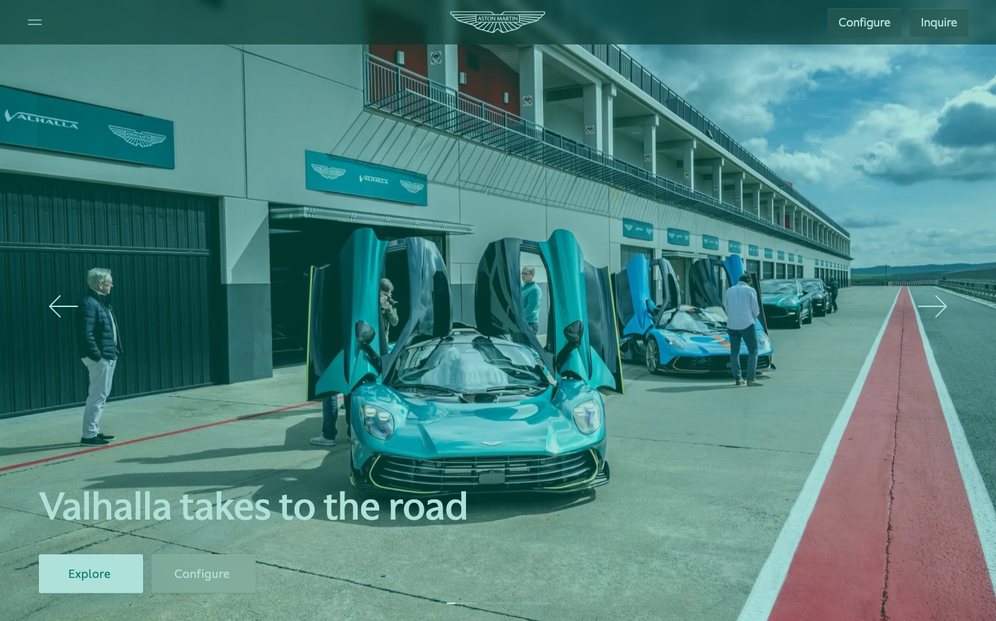Aston Martin's digital presence mirrors their automotive heritage with theatrical luxury and precision engineering. The signature teal-cyan overlay creates an otherworldly, premium atmosphere while custom typography (AstonMartinFlare and AstonMartinSans) reinforces their bespoke British craftsmanship identity.