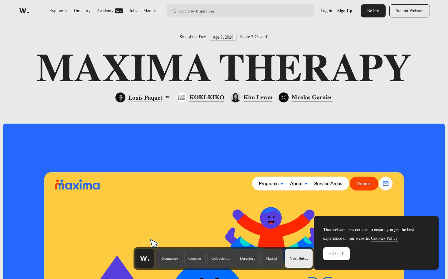 Awwwards embodies editorial sophistication with its massive typographic hierarchy and pristine white space, creating an atmosphere of design critique and curatorial authority. The bold 'MAXIMA THERAPY' headline dominates like a magazine masthead, while the vibrant orange gradient creates warmth against the clinical precision of the layout.