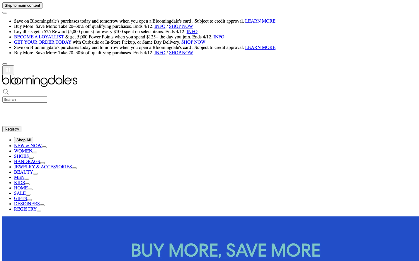 Bloomingdale's embodies traditional luxury retail through classical typography and institutional whitespace, creating an atmosphere of established prestige. The heavy use of Times serif across all content suggests heritage and sophistication, while the stark blue promotional banner creates dramatic contrast against the otherwise minimal interface.