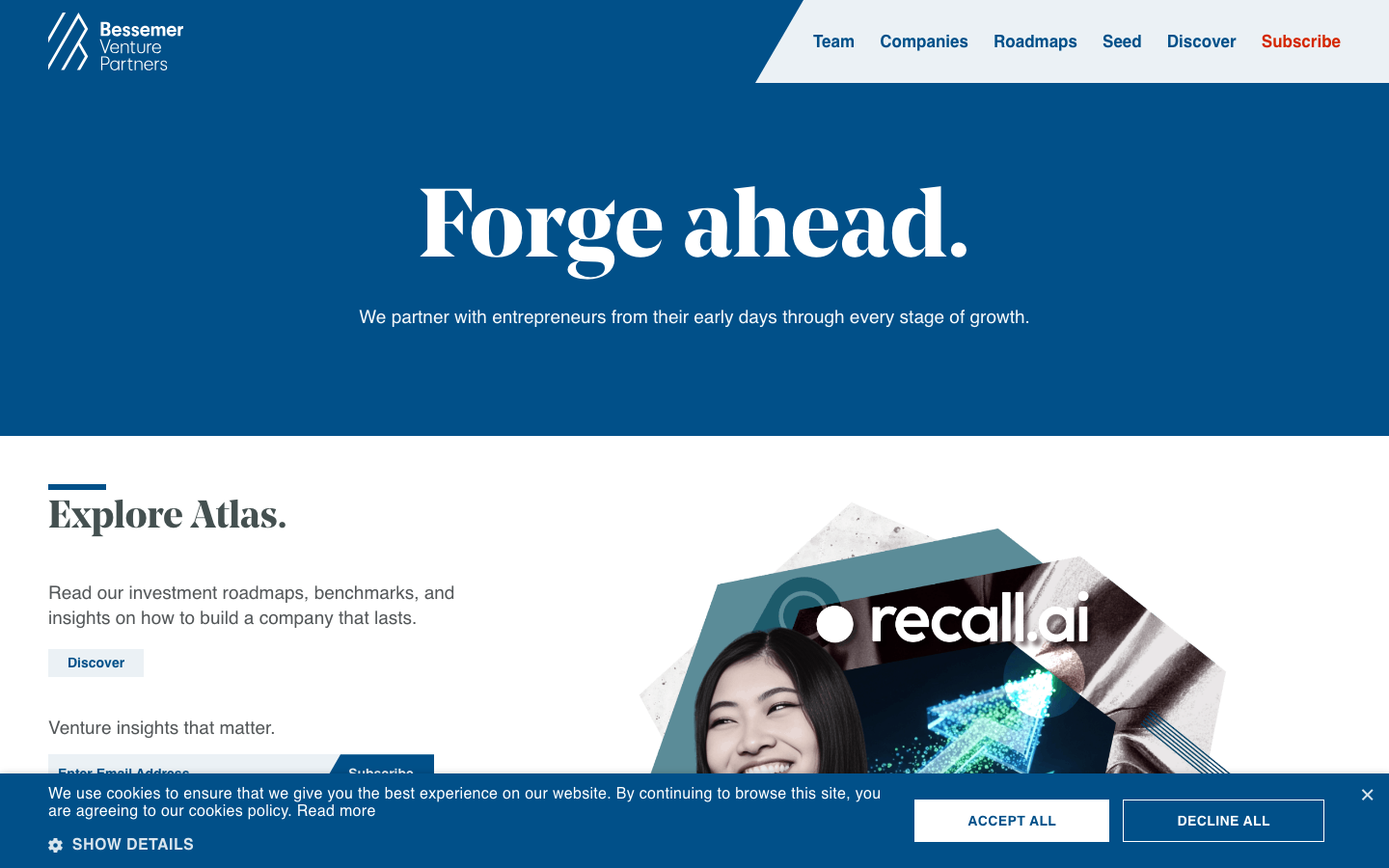 Bessemer projects institutional gravitas through a deep nautical blue paired with bold serif headlines that command authority. The design balances venture capital sophistication with approachable warmth, using dramatic typography contrasts and generous whitespace to convey both prestige and accessibility.