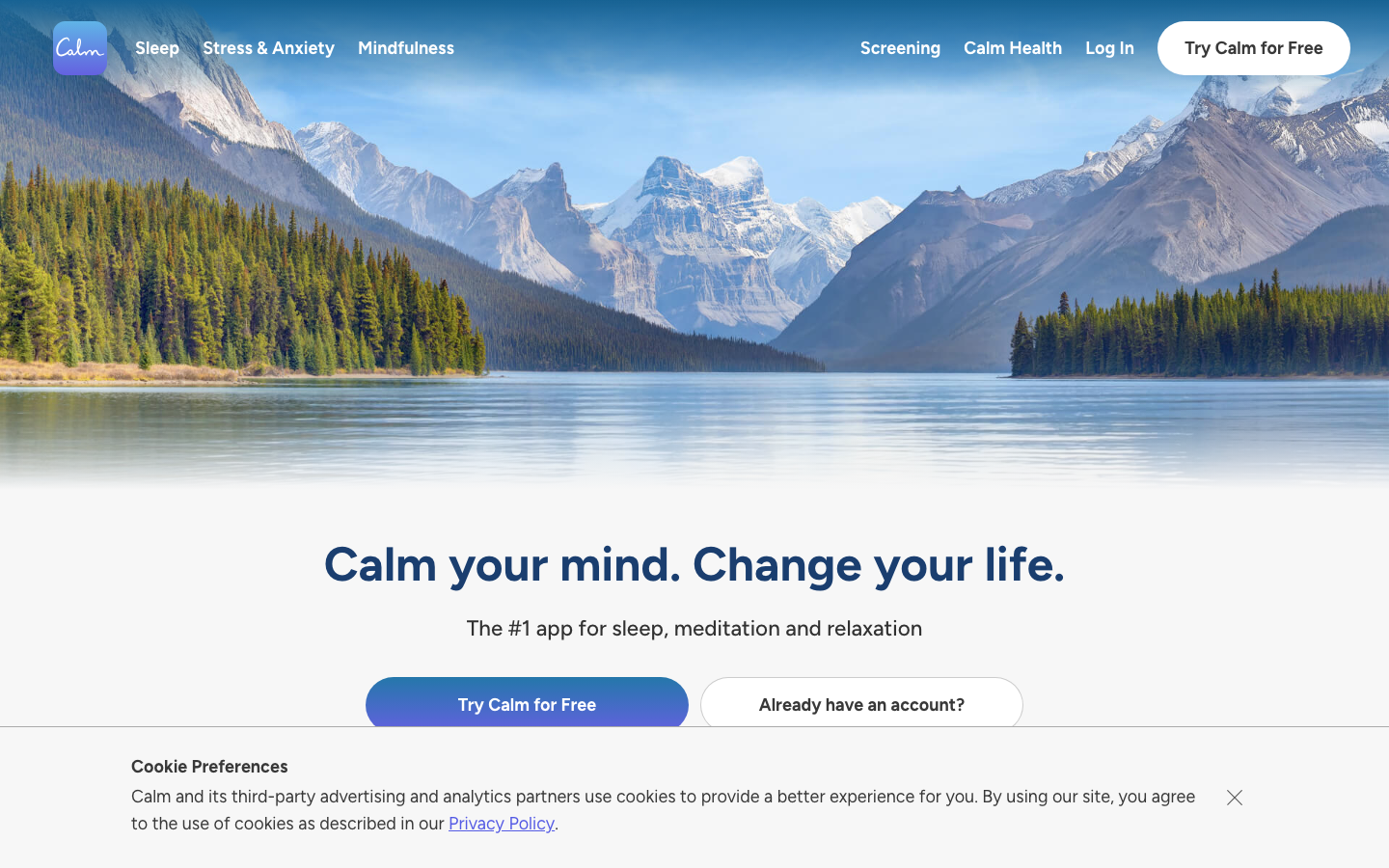Calm creates a transcendent wellness aesthetic through expansive mountain lake photography paired with the warm, friendly Figtree typeface. The brand uses generous whitespace and cinematic nature imagery to evoke deep tranquility and mental clarity, positioning meditation as an aspirational lifestyle choice rather than clinical therapy.