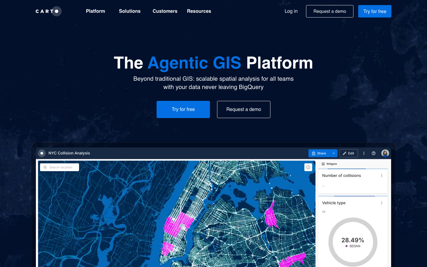 Carto presents a sophisticated nocturnal aesthetic that merges deep space navigation with data precision. The bold Montserrat headlines create commanding presence while the cosmic blue palette evokes technical depth and analytical intelligence, positioning GIS as an adventurous frontier rather than dry enterprise software.