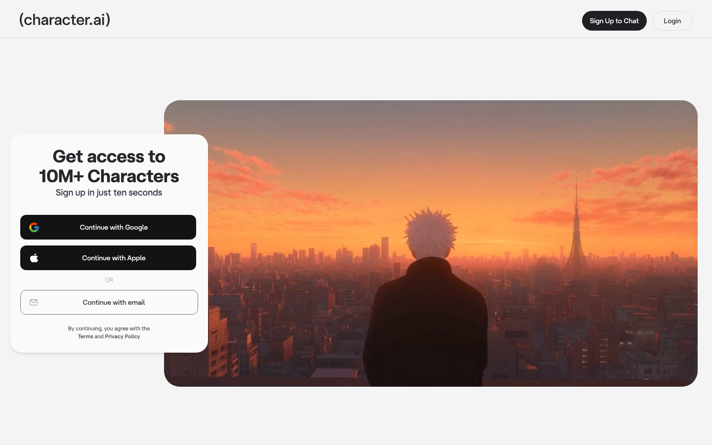 Character.AI creates an immersive, almost cinematic experience that feels like stepping into an anime world. The dramatic sunset cityscape backdrop paired with clean, approachable UI components suggests sophisticated AI technology made accessible to creative storytellers and roleplay enthusiasts.