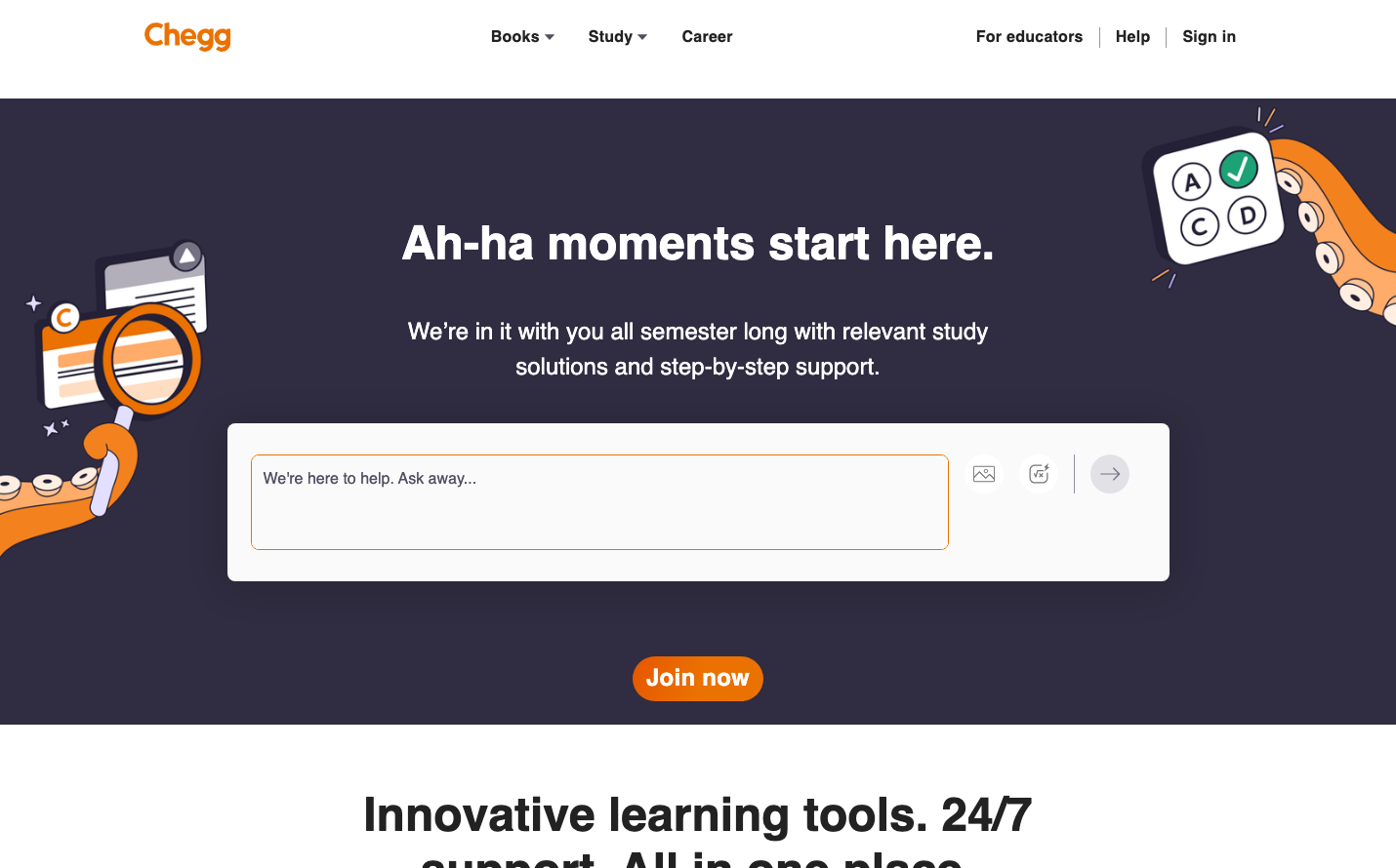 Chegg's brand radiates academic optimism through warm orange energy against deep purple midnight tones, creating a cozy study-session atmosphere. The playful illustrated elements and friendly geometric shapes suggest approachable expertise rather than intimidating academia.