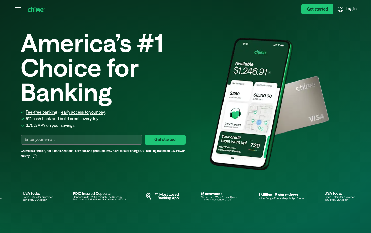 Chime's brand radiates approachable financial confidence through a harmonious deep forest green that feels both trustworthy and refreshing. The custom 'Chime Saans' typography strikes a perfect balance between friendly accessibility and professional authority, while the mobile-first composition emphasizes real-world utility over flashy aesthetics.
