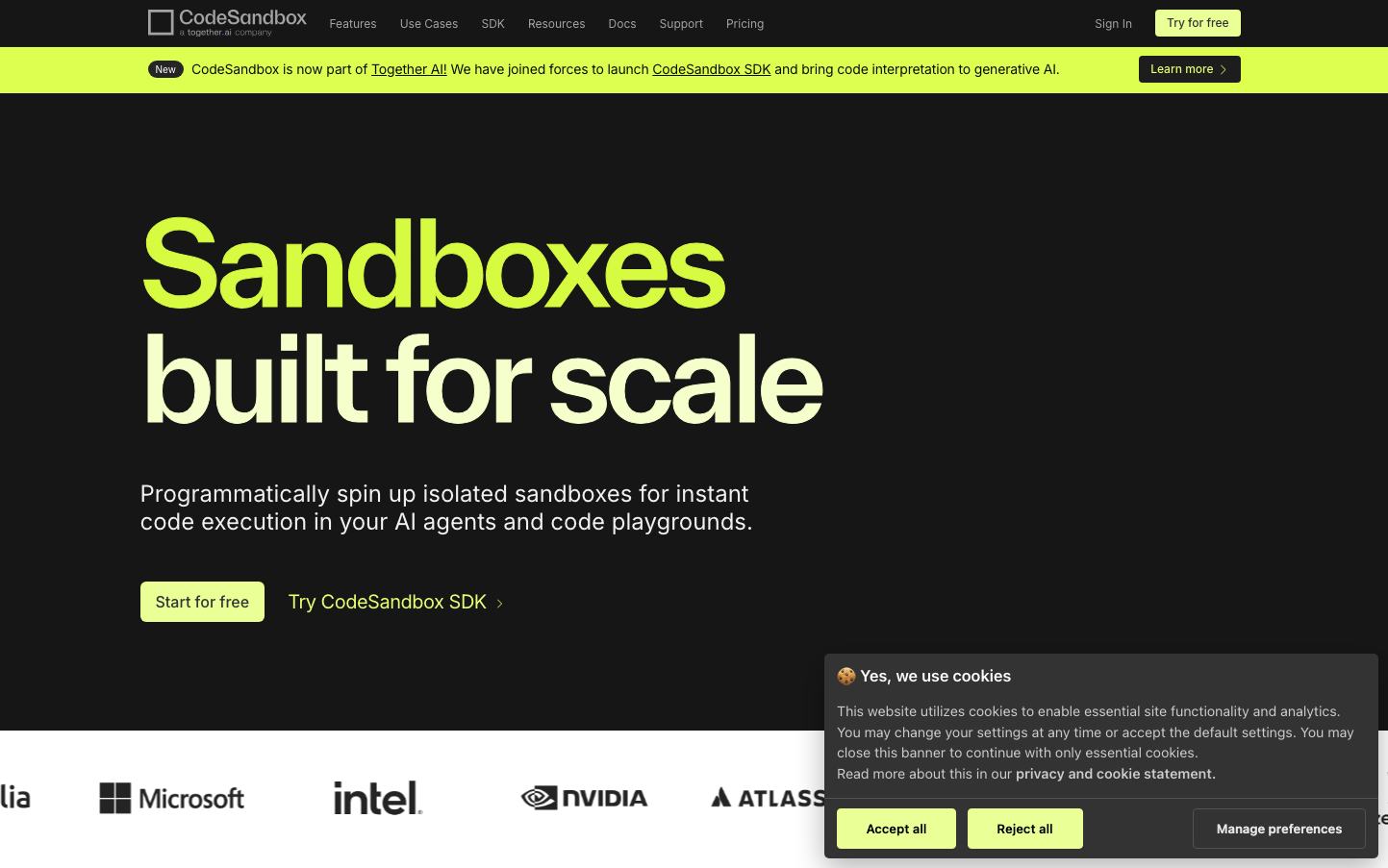 CodeSandbox wields a nocturnal developer aesthetic with dramatic dark backgrounds and electric lime green accents that feel like syntax highlighting come to life. The massive 120px headline typography creates an imposing, almost architectural presence that screams technical confidence and enterprise-grade capability.