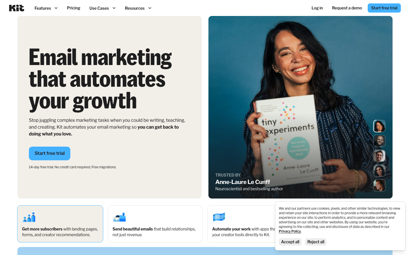 Kit (ConvertKit) presents a human-centered email marketing brand that balances sophistication with approachability through warm, rounded elements and a vibrant blue-to-teal gradient aesthetic. The design emphasizes authentic connection over corporate sterility, using generous white space and friendly photography to create an inviting atmosphere for creators.