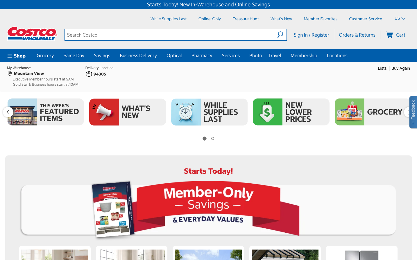 Costco's design embodies warehouse-scale efficiency with a bold red-and-blue palette that screams American retail trust. The dense, information-heavy layout mirrors the packed warehouse experience - maximizing value and content per square inch without sacrificing functionality.