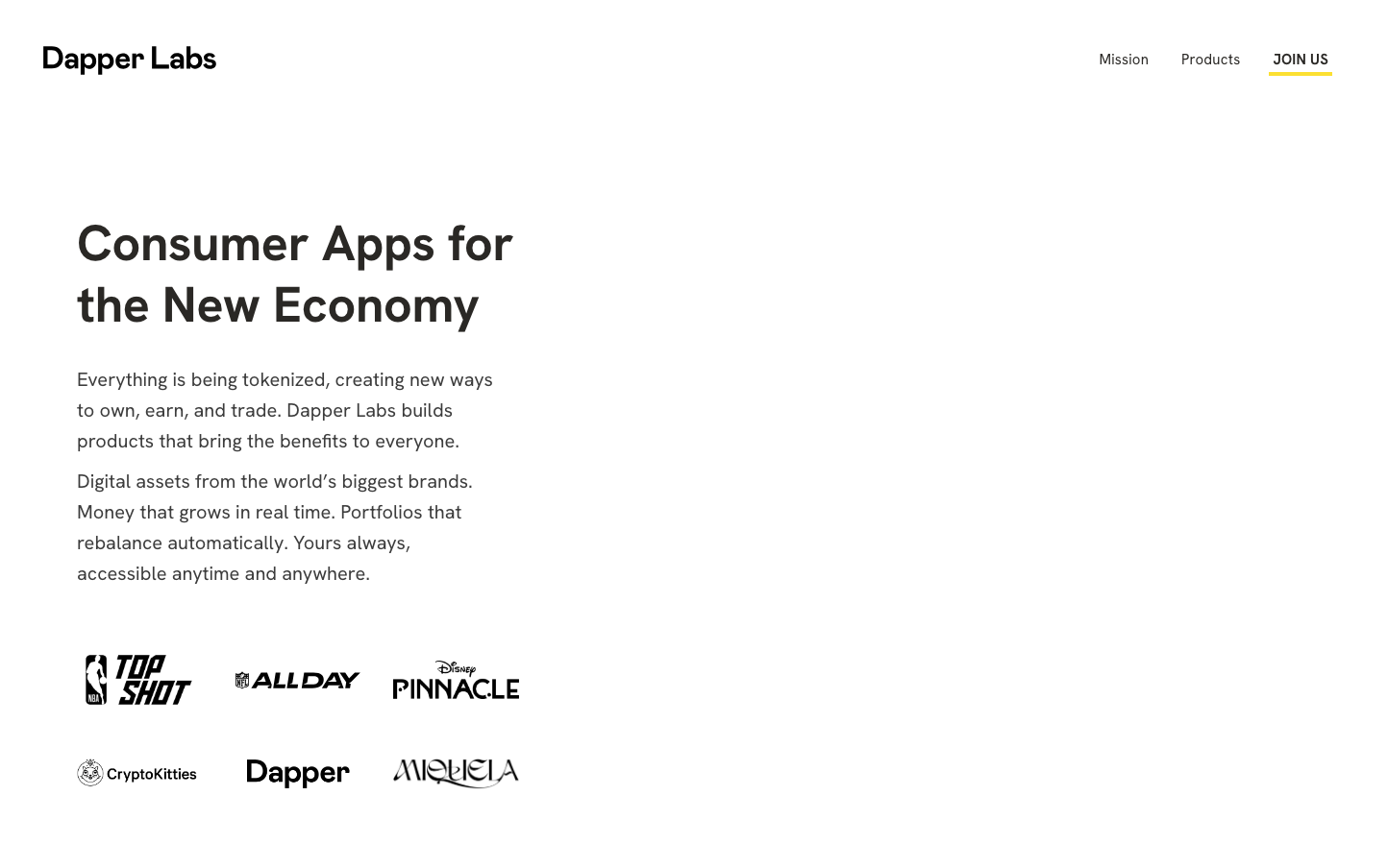Dapper Labs projects confident minimalism through oversized Hanken Grotesk typography and stark white space, creating a sense of institutional authority in the crypto space. The monochromatic palette with strategic brand logo splashes suggests serious enterprise focus while the generous spacing conveys premium positioning.
