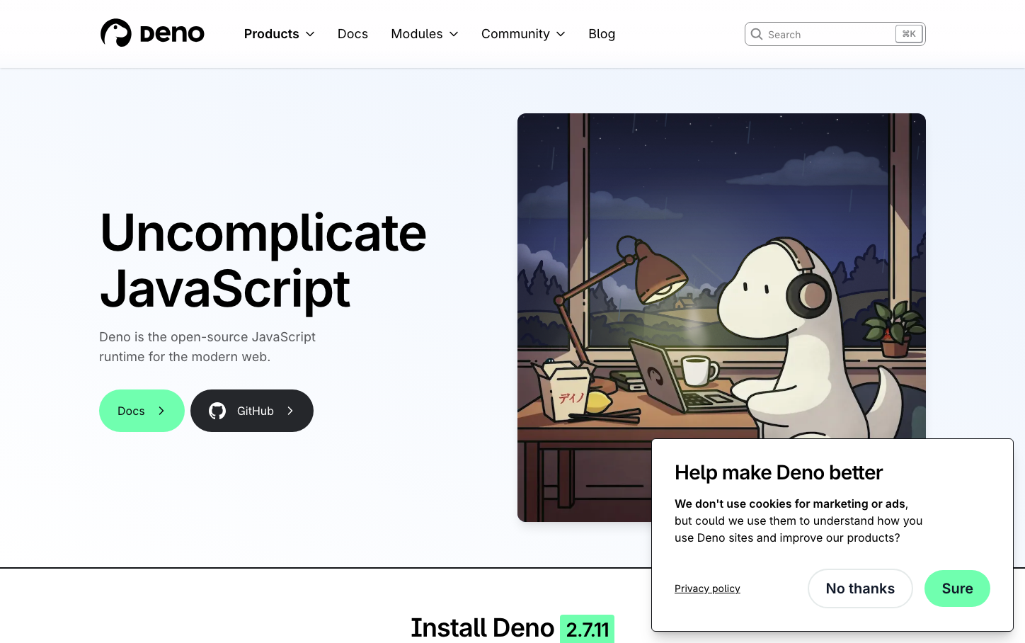 Deno creates a nocturnal, studio-like atmosphere with its signature electric mint green (#70ffaf) paired with dramatic dark backgrounds and a charming dinosaur mascot. The design balances technical precision with warmth, using Inter typography and a cozy illustrated aesthetic that makes JavaScript development feel approachable yet sophisticated.