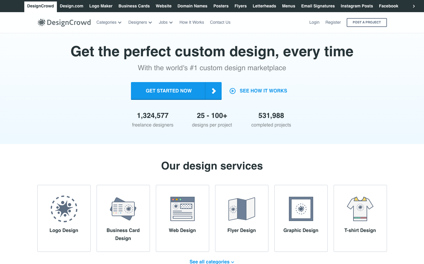 The generous use of whitespace combined with bold numerical statistics (1,324,577 freelancers) creates a data-driven confidence that's uniquely marketplace-focused, while the grid of simple iconographic service cards maintains creative approachability.