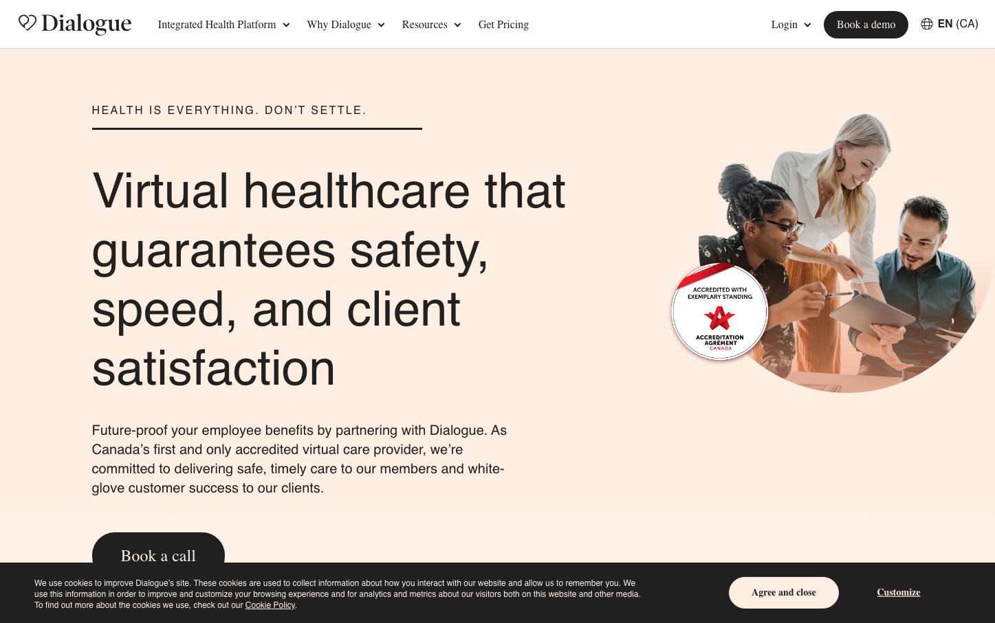 Dialogue creates a sophisticated healthcare identity through the dramatic contrast of editorial serif headlines with clean sans-serif body text, wrapped in warm peachy tones that humanize medical technology. The brand feels like a premium health magazine brought to life as a digital platform.