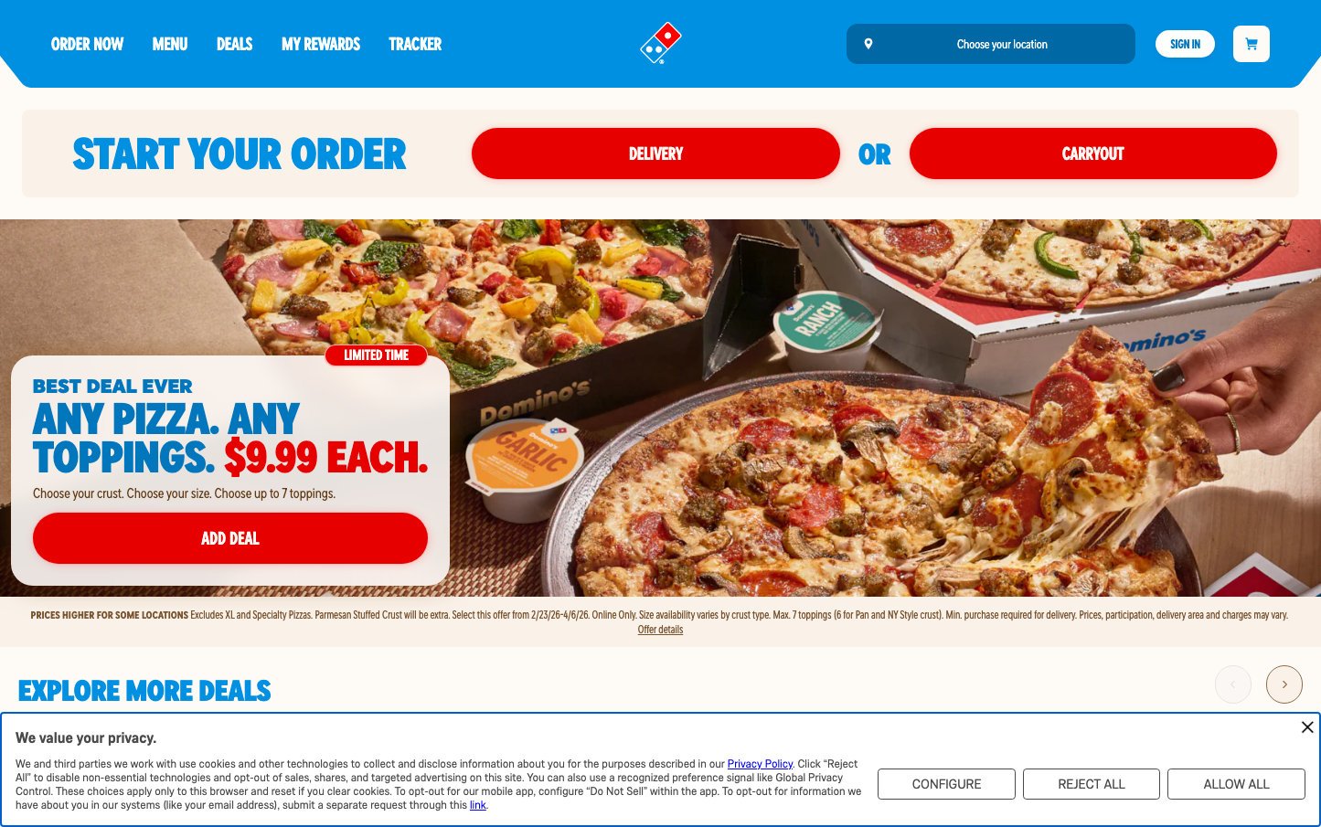 Domino's combines aggressive red call-to-actions with approachable blue accents over warm cream backgrounds, creating a distinctly American fast-food energy that feels urgent yet friendly. The custom Dominos Sans typography reinforces brand ownership while maintaining high readability for quick ordering decisions.