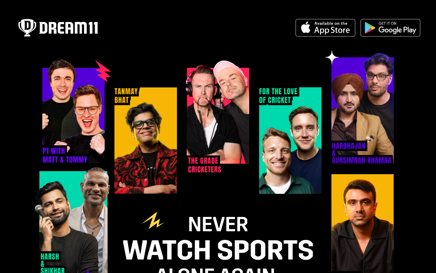 Dream11 embraces a bold, entertainment-first aesthetic that treats sports betting like premium gaming content. The vibrant color-blocked cards against deep black backgrounds create an electric, nocturnal energy that screams 'high-stakes excitement' rather than traditional corporate sports.