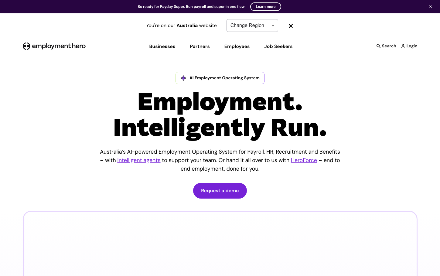 Employment Hero commands attention with ultra-bold Saiga typography that screams confidence, balanced by clean DM Sans body text. The vibrant purple (#9b51e0) creates an energetic, forward-thinking atmosphere that feels both professional and disruptively modern.