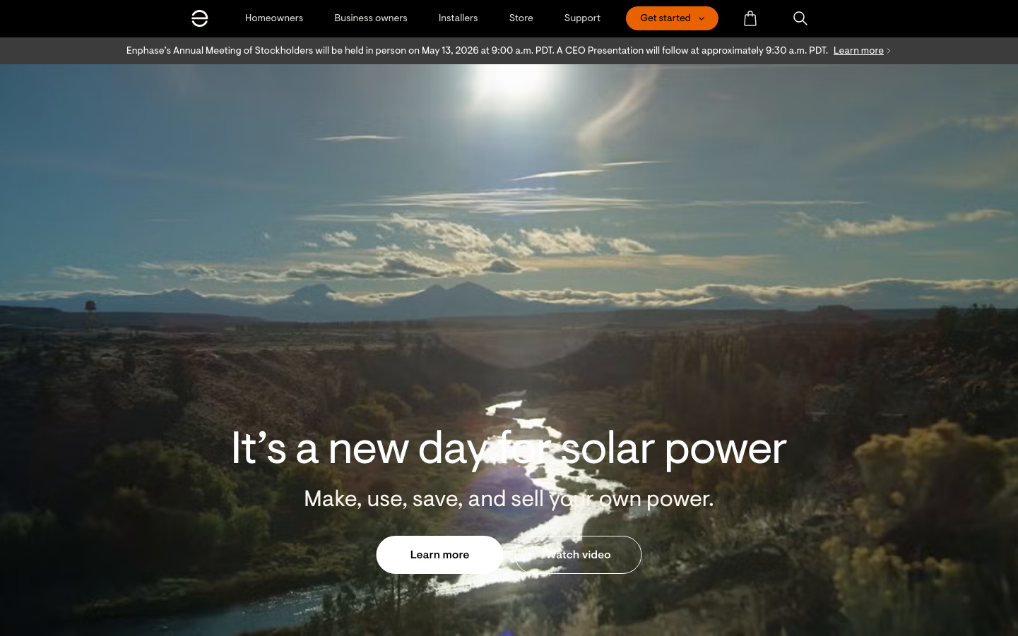 Enphase Energy projects aspirational sustainability through cinematic landscape photography paired with confident, minimal typography. The warm orange primary button creates urgency against ethereal natural backdrops, while the custom Visuelt typeface feels approachable yet authoritative—speaking to homeowners ready to make the solar leap.