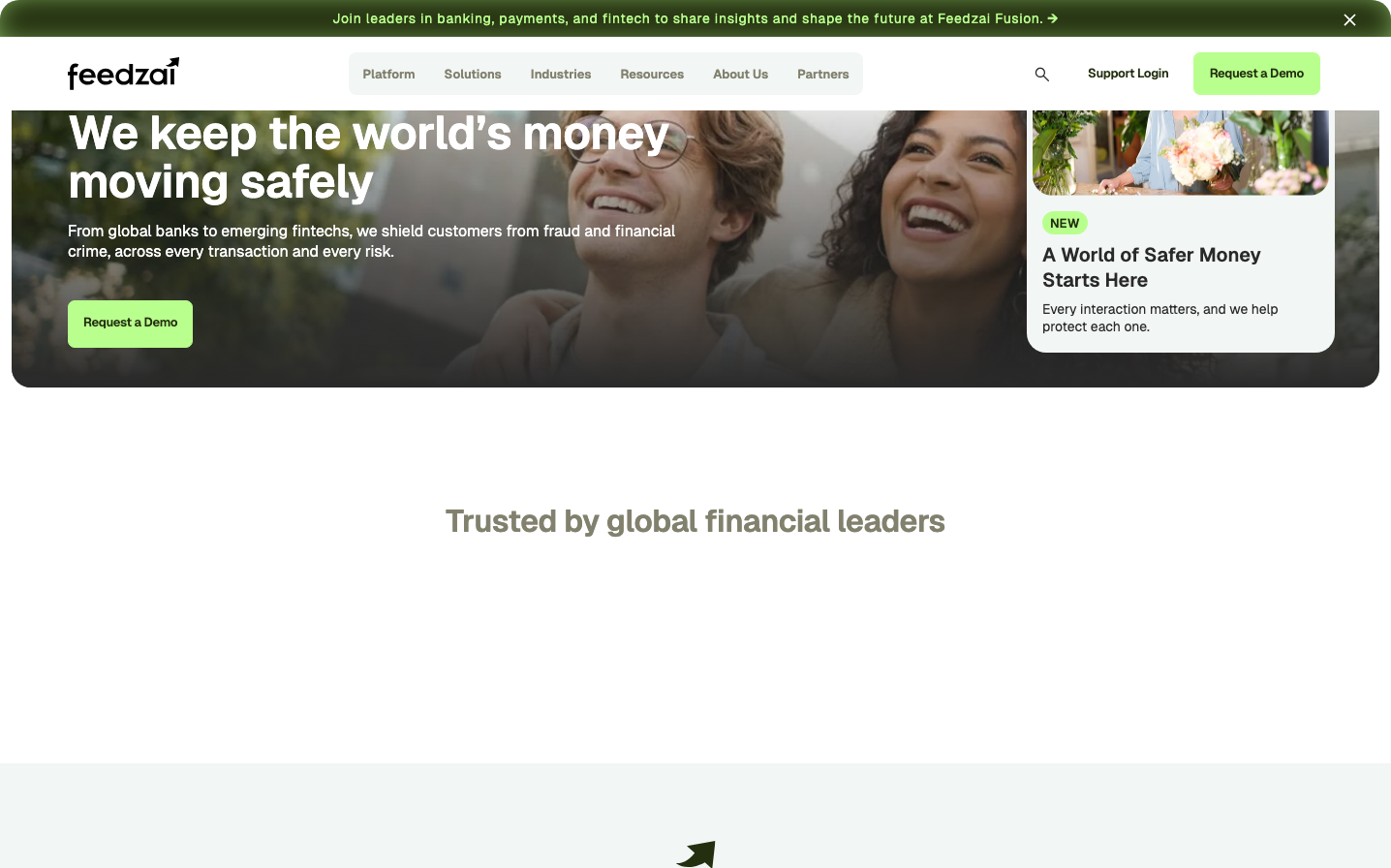 Feedzai presents a professional yet approachable fintech aesthetic built around a distinctive vibrant lime-green signature that cuts through the serious financial services landscape. The Geist typography creates a technical precision feel while maintaining warmth through generous spacing and human-centered imagery of genuine moments.