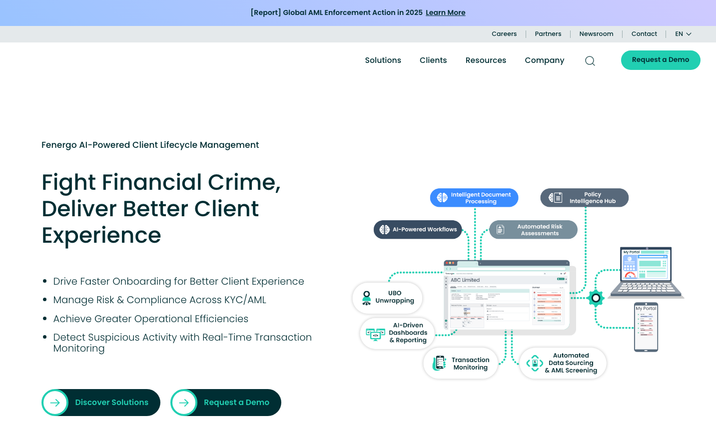 Fenergo projects financial technology sophistication through its signature teal accent against clean whites and grays, using Poppins typography to balance approachability with authority. The design feels like a premium fintech consultancy - professional enough for enterprise banking yet modern enough for digital transformation.
